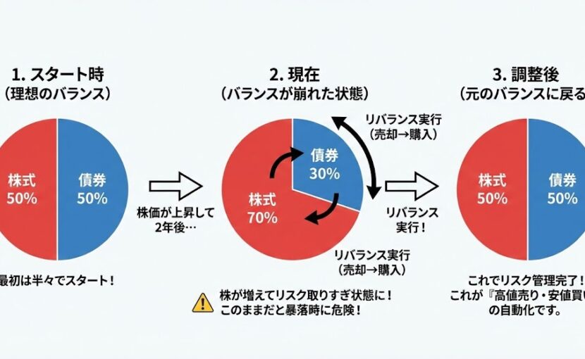 【今やるべきこと】 増えすぎた資産(例えば株式)の一部を売却し、減っている資産(債券など)を買い増して、元の比率に戻すこと。これを「リバランス」と言います。 「高い時に売り、安い時に買う」という投資の鉄則を、リバランスを通じて機械的に行うことができるのです。